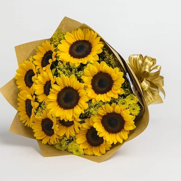 Buquê composto por 12 girassóis naturais de hastes longas, envoltos em papel kraft e laço dourado. Flores frescas e vibrantes que transmitem alegria e luz, ideais para celebrações, homenagens e momentos especiais.